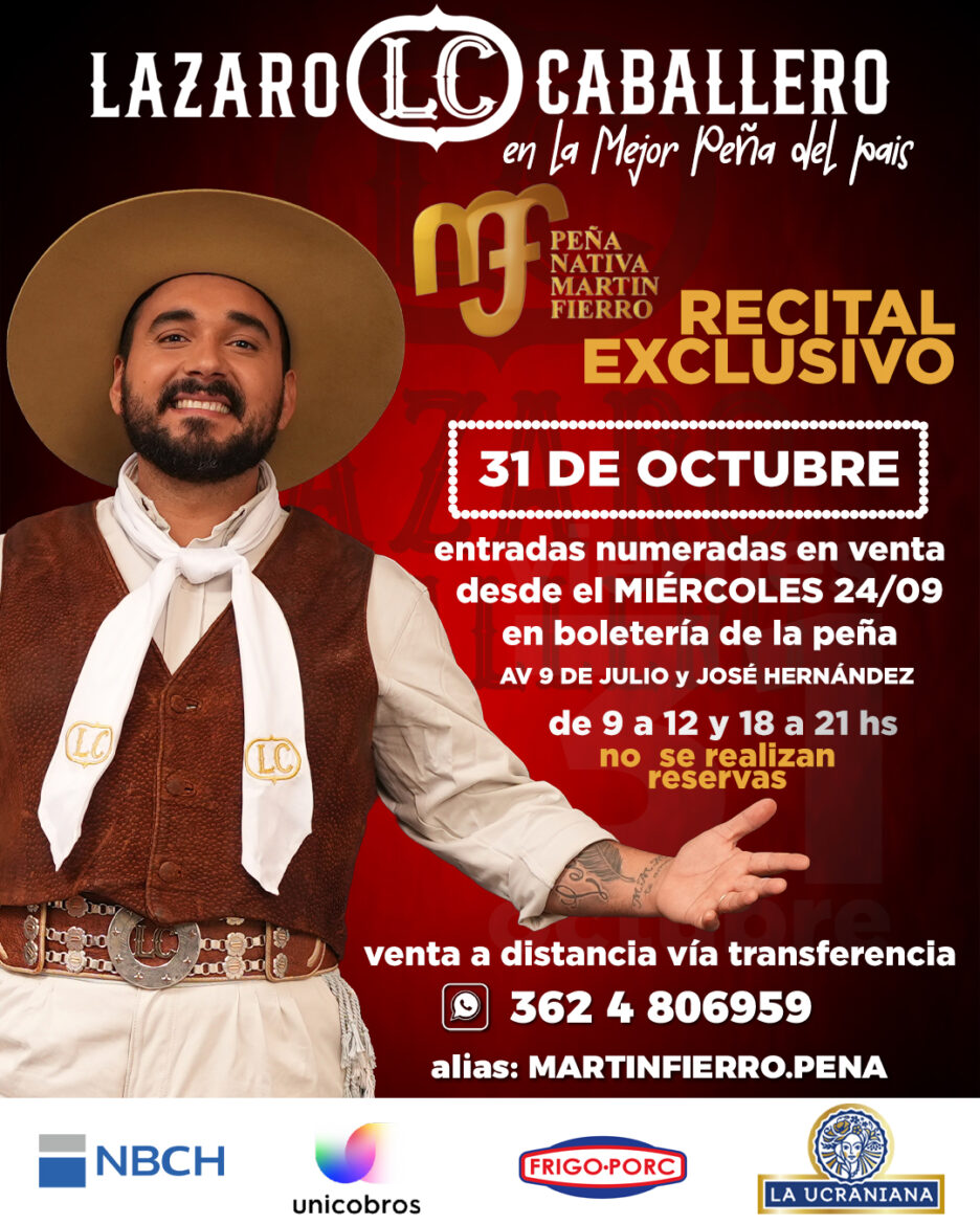 LAZARO CABALLERO (Show en Vivo) Llega a la Mejor Peña del País Recital Exclusivo !!!! Compra de Entradas presencial (Av. 9 de Julio y José Hernández) o al 3624-806959